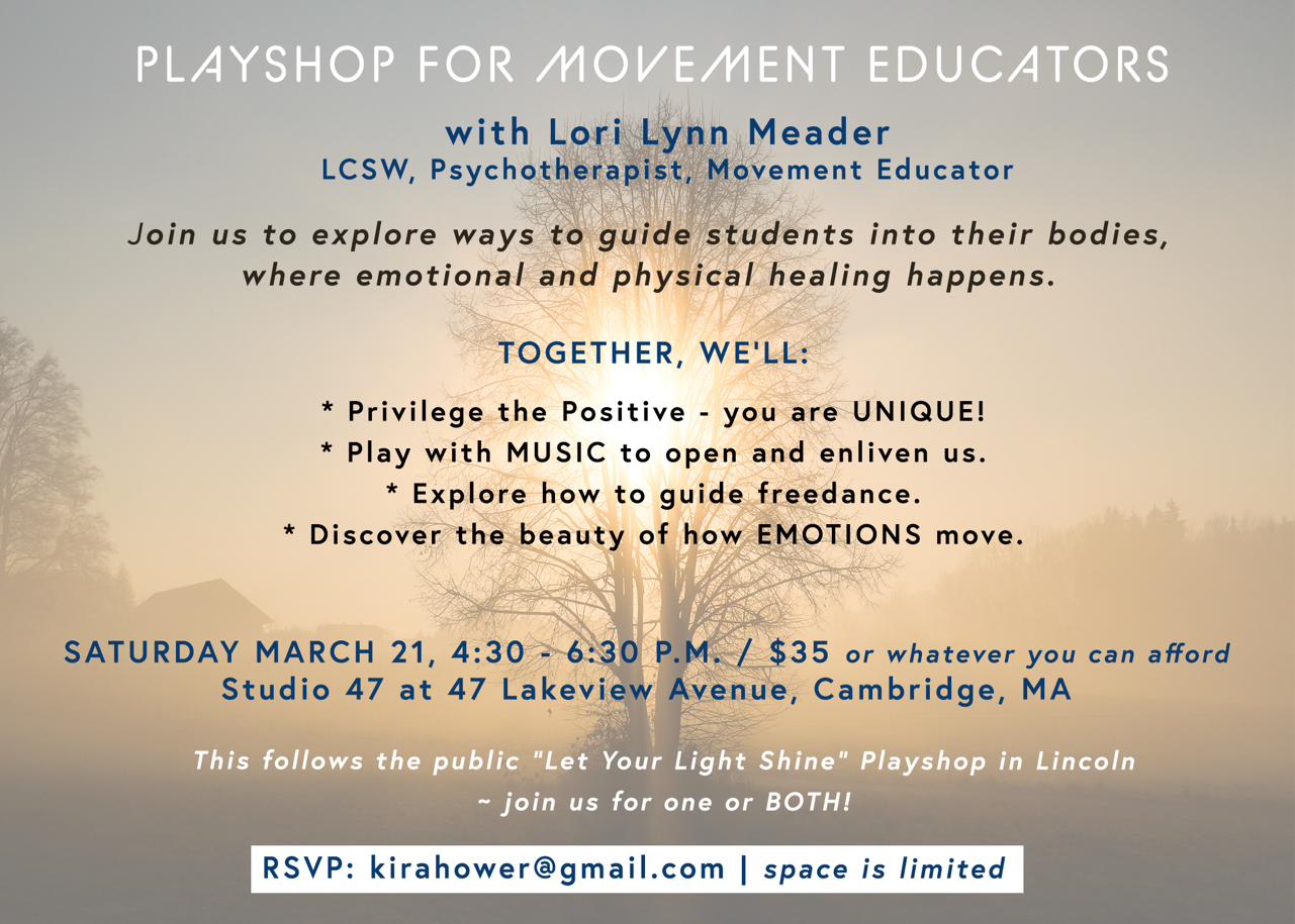 Boston movement teachers, dance/movement therapists, somatic psychotherapists - to all who guide or hold space for others. I invite you to bring your expertise for a playshop designed especially for YOU. Let’s learn and play TOGETHER!